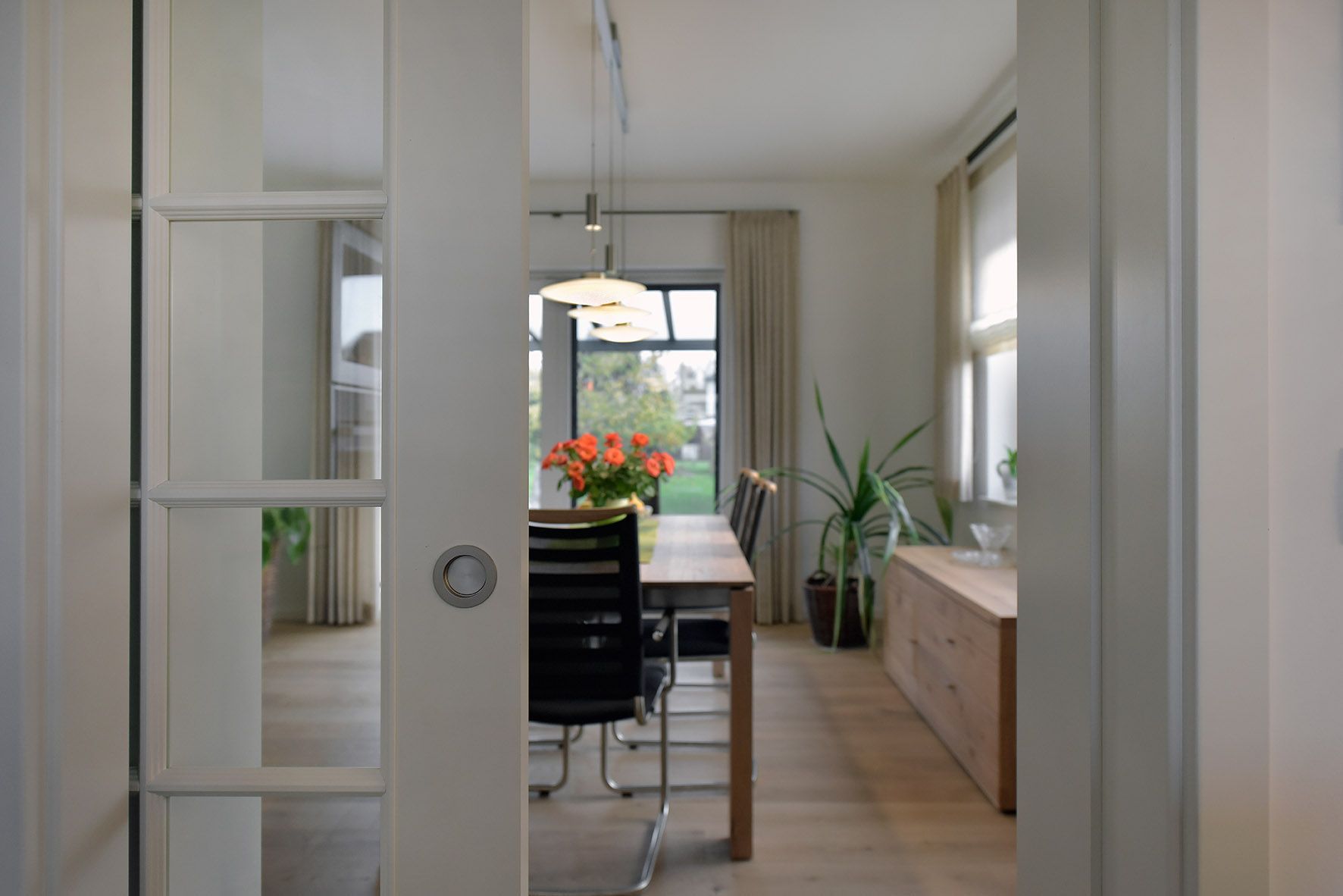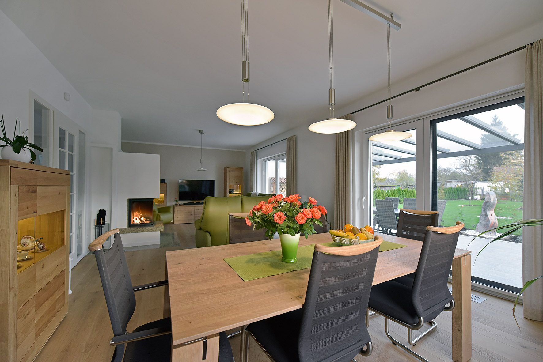 Der Wohnbereich dieser Stadtvilla beeindruckt mit Offenheit und Eleganz. Der nahtlose Übergang zwischen Wohn-, Ess- und Küchenbereich schafft eine harmonische Verbindung, die das Haus noch großzügiger wirken lässt. Große Fensterfronten lassen viel Tageslicht hinein und bieten einen wunderbaren Blick ins Grüne.